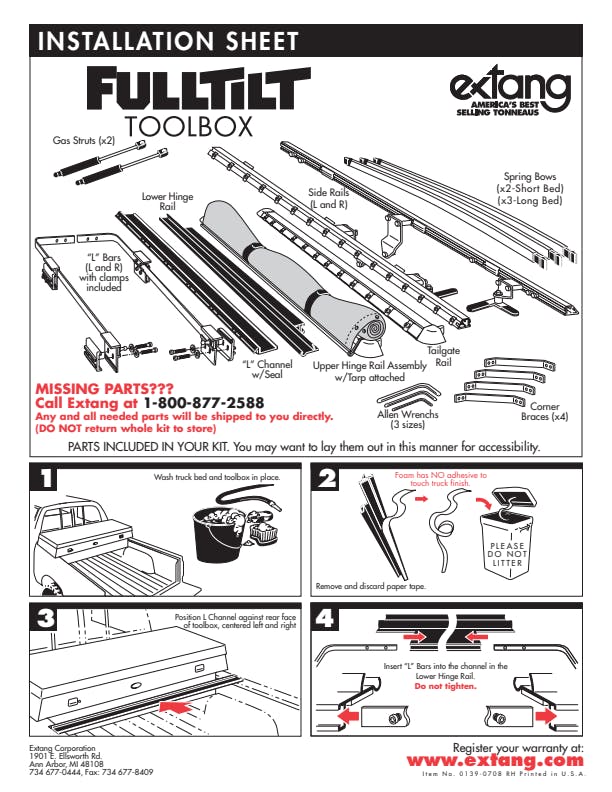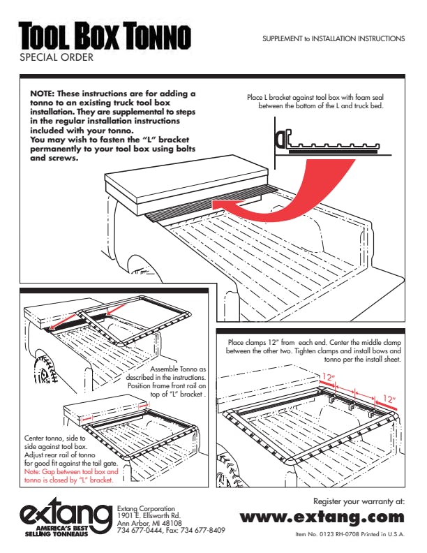 Incredible Versatility Roll Up Lift Up or Lift Off; Bridges Toolbox-To-Tonneau For Perfect Fit; L-Channel design also provides for rain drainage; Fits Most Standard 20 in. Tool Boxes; Designed To Be Removed By One Person; Gas Shocks Easily Removed Using Ball And Joint Snap Release; No Tools Required; Simply The Tonneau At The Hinge Lift Up And It Will Disconnect